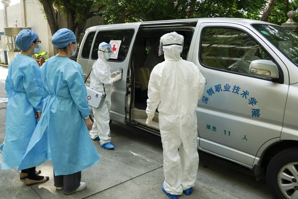 值班護(hù)士將疑似患者送上專用車輛。