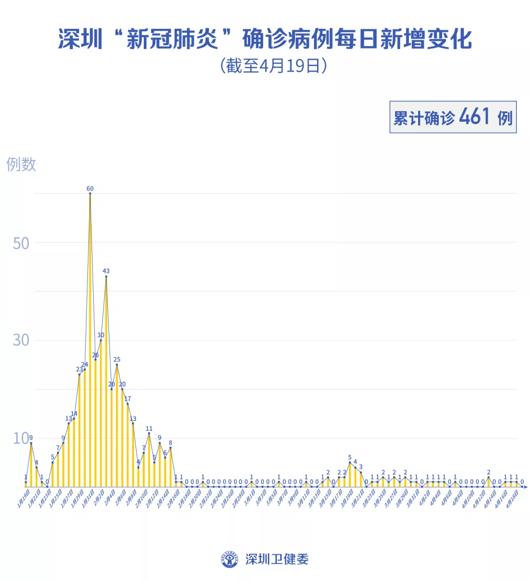 截至4月19日24時,深圳累計報告新冠肺炎病例461例。4月19日當天新增無癥狀感染者2例,出院1例。