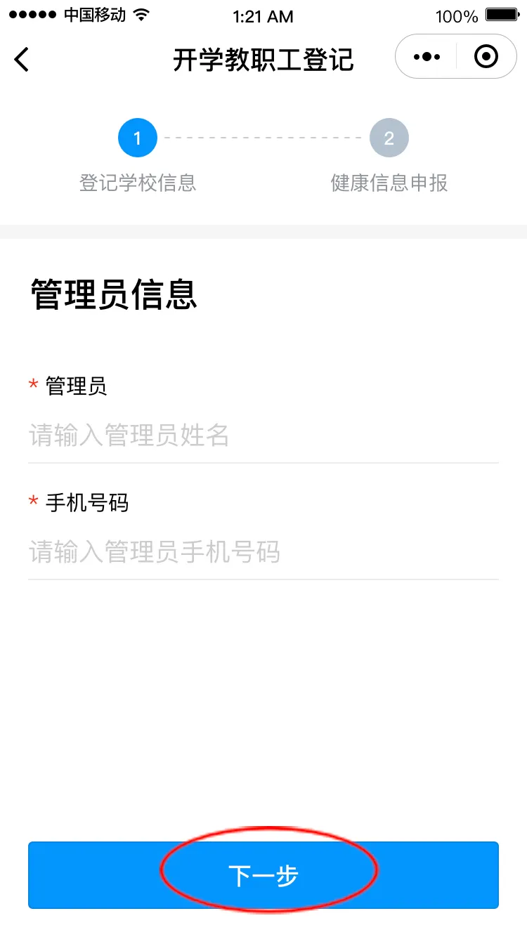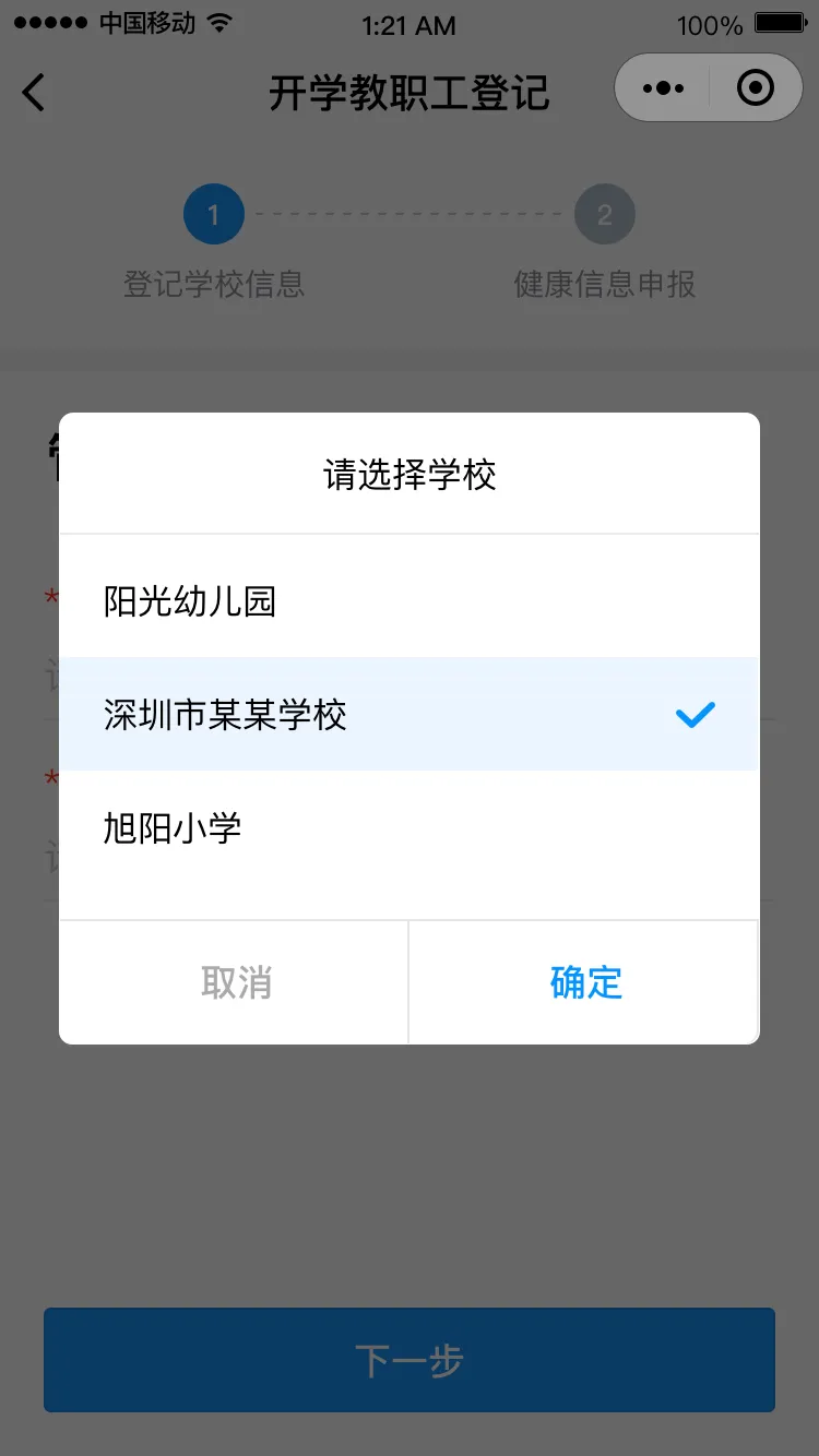 點擊“馬上登記”進入登記界面,填寫學(xué)校管理員姓名和手機號碼(學(xué)校管理員姓名和手機號碼請詢問學(xué)校獲得),點擊“下一步”,請選擇對應(yīng)的學(xué)校,進入健康申報卡界面。