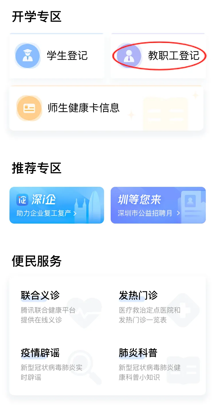 在開學(xué)專區(qū),點擊“教職工登記”進行自主申報和實名認證。