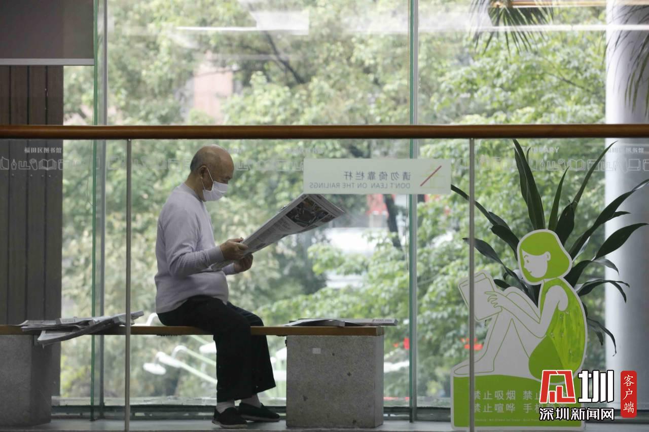 福田圖書館內(nèi),一位市民正在閱讀報紙。