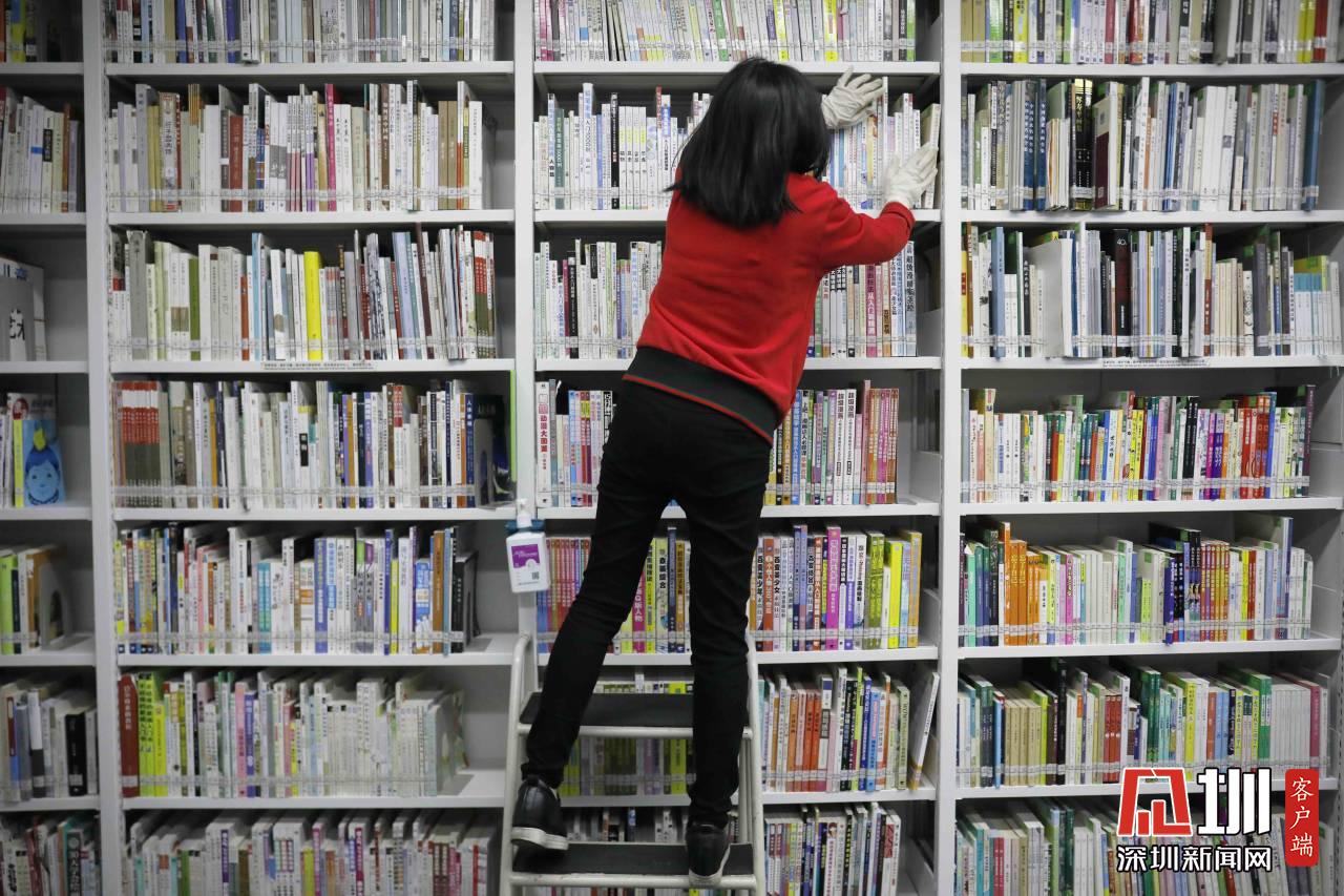 工作人員正在對福田圖書館的書做消毒處理。