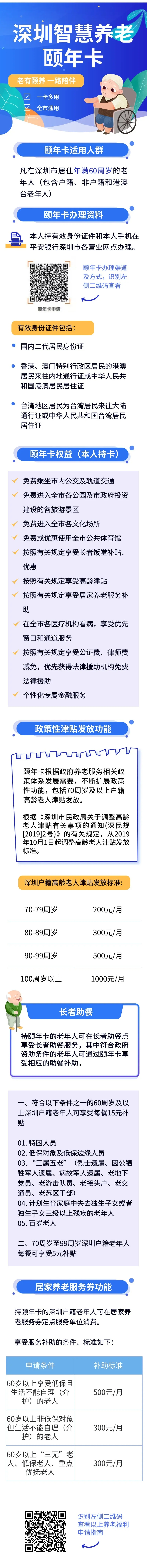 據(jù)悉,凡在深圳市居住年滿60周歲以上的老年人(包含港澳臺(tái)老年人),均可持有效身份證件和手機(jī)申請辦理?!邦U年卡”持卡人,可享受敬老優(yōu)待,包括免費(fèi)進(jìn)入全市各公園,免費(fèi)進(jìn)入市政府投資建設(shè)各旅游景區(qū),免費(fèi)乘坐市內(nèi)公交車和軌道交通。70周歲及以上戶籍老人還可享受高齡津貼發(fā)放;符合規(guī)定的戶籍老年人可享受居家養(yǎng)老消費(fèi)的優(yōu)惠和補(bǔ)貼,包括:生活照料、家政服務(wù)、康復(fù)護(hù)理服務(wù)、日托服務(wù)、心理咨詢等。