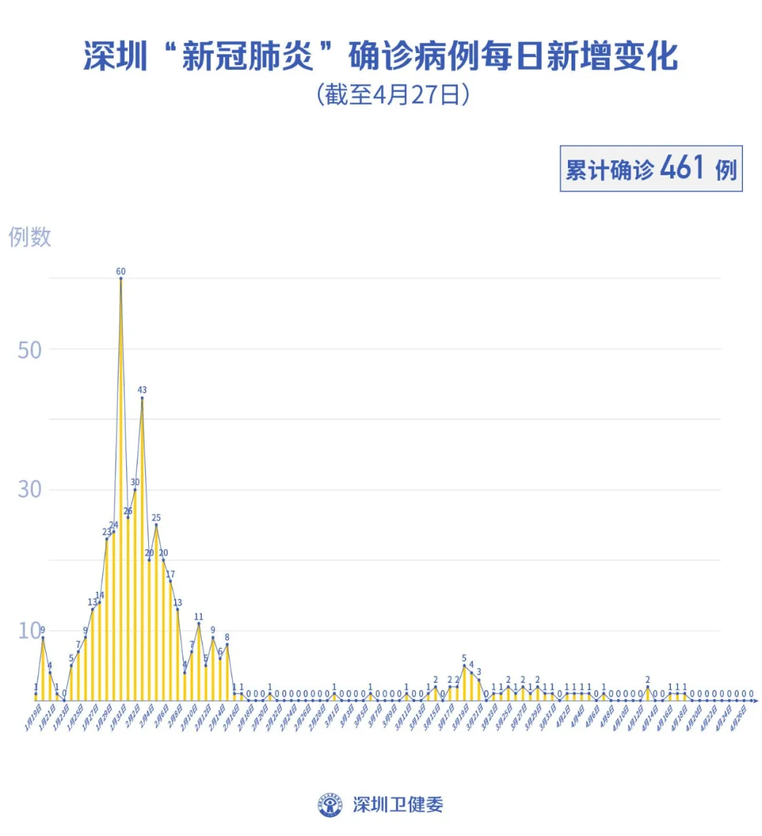截至4月27日24時,深圳累計(jì)報告新冠肺炎病例461例。4月27日當(dāng)天新增無癥狀感染者1例,出院1例。