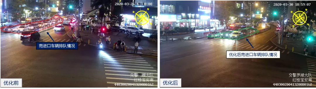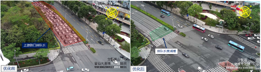 針對此情況,深圳交警對該路口綠信比方案進行優(yōu)化調(diào)整,延長西面放行時間,同時壓縮北面和東面放行時間。優(yōu)化后,路口晚高峰持續(xù)時間縮短17.6%,南進口車輛通行效率提升明顯,路口其余方向車輛排隊無明顯增加。