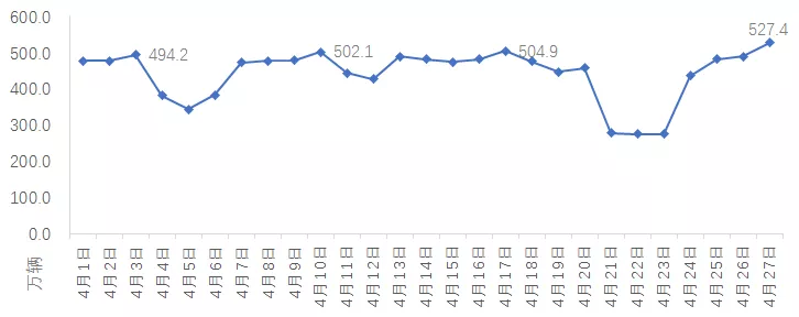 早晚高峰車流量逐日增加,高峰持續(xù)時間更長深圳早晚高峰交通流量以“星期”為單位呈現(xiàn)逐日上升趨勢,2月末全市車流量已恢復(fù)至正常工作日水平。3月末的497.6萬輛/天已超過去年同期的487.8萬輛/天。4月,全市車流量仍然呈上升趨勢,4月27日的車流量已達(dá)527.4萬輛/天。車流量的不斷激增、早晚高峰集中出行,導(dǎo)致高峰持續(xù)時間較往年更長。