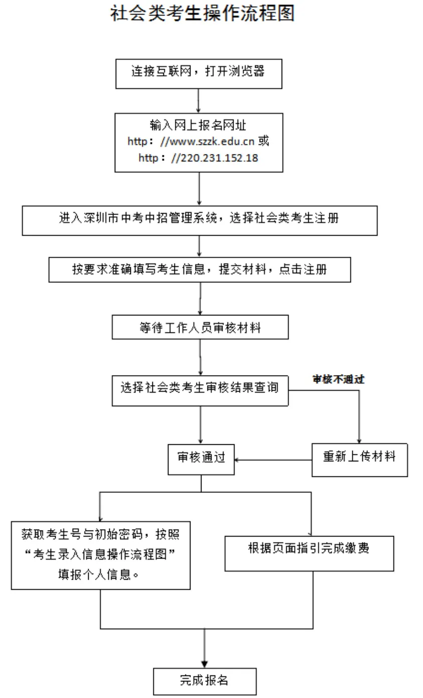 見圳客戶端·深圳新聞網(wǎng)2020年4月30日訊 據(jù)深圳市教育局消息,2020年深圳高中階段學(xué)校招生考試(以下簡(jiǎn)稱“中考”)報(bào)名定于5月6日-15日進(jìn)行,考試時(shí)間為7月20日-21日。 今年本市應(yīng)屆初中畢業(yè)生仍繼續(xù)在就讀學(xué)校集體辦理報(bào)名手續(xù)。符合深圳中考報(bào)名條件的深圳戶籍往屆生、在市外就讀的深圳戶籍應(yīng)屆初中畢業(yè)生(以下簡(jiǎn)稱“社會(huì)類考生”)采用網(wǎng)上報(bào)名方式進(jìn)行報(bào)名。 報(bào)名條件 一、具有我市戶籍的初中畢業(yè)生,可以在我市報(bào)名參加中考。 二、具有我市初三學(xué)籍的隨遷子女可以報(bào)名參加中考,同時(shí)符合以下條件的,可以參加相應(yīng)的公辦普高、民辦普高和中職學(xué)校的劃線錄取。 (一)父親或母親在我市具有合法穩(wěn)定職業(yè); (二)父親或母親在我市具有合法穩(wěn)定住所; (三)父親或母親持有有效《深圳經(jīng)濟(jì)特區(qū)居住證》; (四)父親或母親在我市繳納基本養(yǎng)老保險(xiǎn)及基本醫(yī)療保險(xiǎn),且至少其中一個(gè)險(xiǎn)種累計(jì)繳費(fèi)滿3年,社保累計(jì)年限計(jì)算截至2020年8月31日; (五)隨遷子女在我市具有3年完整初中學(xué)籍。 不符合上述條件但具有我市初中學(xué)籍的隨遷子女,可以在我市參加中考,但僅限于參加民辦普高補(bǔ)錄或中職學(xué)校注冊(cè)入學(xué)。 三、高中階段學(xué)校在校生不得報(bào)名。 本市應(yīng)屆初中畢業(yè)生報(bào)名辦法 本市應(yīng)屆初中畢業(yè)生于5月6日至7日在就讀學(xué)校集體辦理報(bào)名手續(xù)。 今年中考繼續(xù)實(shí)行網(wǎng)上報(bào)名。要求各學(xué)校開放計(jì)算機(jī)房,為本校考生上網(wǎng)報(bào)名提供方便。 5月8日至15日,學(xué)校組織考生進(jìn)行電子攝像,學(xué)校和考生分別上網(wǎng)錄入報(bào)名信息,考生錄入信息可參考“考生錄入信息流程圖”進(jìn)行操作。 市教育局強(qiáng)調(diào),學(xué)校不得以任何理由拒絕有本校學(xué)籍的應(yīng)屆畢業(yè)生報(bào)考(參加中職學(xué)校自主招生、注冊(cè)入學(xué)的考生,也須報(bào)名參加中考)。如有違反者,將嚴(yán)肅查處,并追究相關(guān)人員責(zé)任。同時(shí)要求各區(qū)有關(guān)職能部門、各有關(guān)學(xué)校(報(bào)名點(diǎn))要嚴(yán)格審查報(bào)名材料。對(duì)不符合報(bào)名條件、弄虛作假而被錄取的考生,一經(jīng)發(fā)現(xiàn),取消其錄取資格;已經(jīng)到錄取學(xué)校報(bào)到注冊(cè)的,取消其學(xué)籍,并追究相關(guān)人員責(zé)任。 社會(huì)類考生報(bào)名辦法 社會(huì)類考生采用網(wǎng)上報(bào)名方式進(jìn)行報(bào)名。報(bào)名考生需在5月6日至15日登錄報(bào)名網(wǎng)址(http://www.szzk.edu.cn/),按照提示進(jìn)行網(wǎng)上注冊(cè),上傳報(bào)名審核資料,由考生戶籍所在區(qū)社會(huì)報(bào)名點(diǎn)進(jìn)行線上審核,審核通過后系統(tǒng)將生成中考考生號(hào)及初始密碼,考生需用獲取的考號(hào)及密碼登錄中考中招管理系統(tǒng),填寫個(gè)人信息,具體操作可參考“考生錄入信息流程圖”。同時(shí)需在報(bào)名截止前根據(jù)指引完成網(wǎng)上繳費(fèi)。 若考生網(wǎng)上報(bào)名審核不通過,需按照系統(tǒng)的不通過原因提示,重新補(bǔ)充審核資料,如多次上傳資料失敗或?qū)徍瞬煌ㄟ^,考生可撥打戶籍所在區(qū)的社會(huì)報(bào)名點(diǎn)電話進(jìn)行咨詢或電話預(yù)約,按照工作人員指示進(jìn)行操作報(bào)名,不要在未預(yù)約的情況下前往社會(huì)報(bào)名點(diǎn),盡量避免出行,減少人員聚集。 社會(huì)類考生操作流程如下圖: