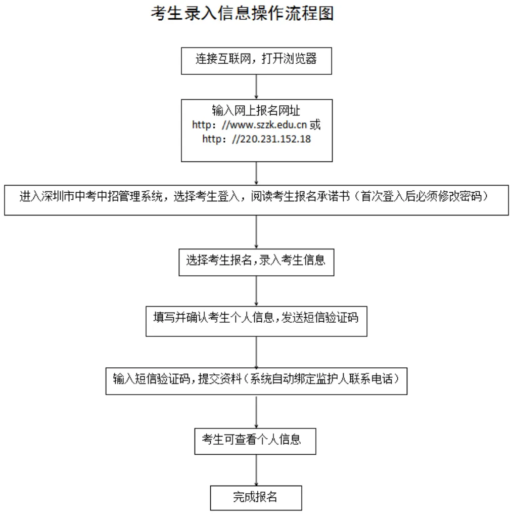 見圳客戶端·深圳新聞網(wǎng)2020年4月30日訊 據(jù)深圳市教育局消息,2020年深圳高中階段學(xué)校招生考試(以下簡稱“中考”)報名定于5月6日-15日進行,考試時間為7月20日-21日。 今年本市應(yīng)屆初中畢業(yè)生仍繼續(xù)在就讀學(xué)校集體辦理報名手續(xù)。符合深圳中考報名條件的深圳戶籍往屆生、在市外就讀的深圳戶籍應(yīng)屆初中畢業(yè)生(以下簡稱“社會類考生”)采用網(wǎng)上報名方式進行報名。 報名條件 一、具有我市戶籍的初中畢業(yè)生,可以在我市報名參加中考。 二、具有我市初三學(xué)籍的隨遷子女可以報名參加中考,同時符合以下條件的,可以參加相應(yīng)的公辦普高、民辦普高和中職學(xué)校的劃線錄取。 (一)父親或母親在我市具有合法穩(wěn)定職業(yè); (二)父親或母親在我市具有合法穩(wěn)定住所; (三)父親或母親持有有效《深圳經(jīng)濟特區(qū)居住證》; (四)父親或母親在我市繳納基本養(yǎng)老保險及基本醫(yī)療保險,且至少其中一個險種累計繳費滿3年,社保累計年限計算截至2020年8月31日; (五)隨遷子女在我市具有3年完整初中學(xué)籍。 不符合上述條件但具有我市初中學(xué)籍的隨遷子女,可以在我市參加中考,但僅限于參加民辦普高補錄或中職學(xué)校注冊入學(xué)。 三、高中階段學(xué)校在校生不得報名。 本市應(yīng)屆初中畢業(yè)生報名辦法 本市應(yīng)屆初中畢業(yè)生于5月6日至7日在就讀學(xué)校集體辦理報名手續(xù)。 今年中考繼續(xù)實行網(wǎng)上報名。要求各學(xué)校開放計算機房,為本??忌暇W(wǎng)報名提供方便。 5月8日至15日,學(xué)校組織考生進行電子攝像,學(xué)校和考生分別上網(wǎng)錄入報名信息,考生錄入信息可參考“考生錄入信息流程圖”進行操作。 市教育局強調(diào),學(xué)校不得以任何理由拒絕有本校學(xué)籍的應(yīng)屆畢業(yè)生報考(參加中職學(xué)校自主招生、注冊入學(xué)的考生,也須報名參加中考)。如有違反者,將嚴肅查處,并追究相關(guān)人員責(zé)任。同時要求各區(qū)有關(guān)職能部門、各有關(guān)學(xué)校(報名點)要嚴格審查報名材料。對不符合報名條件、弄虛作假而被錄取的考生,一經(jīng)發(fā)現(xiàn),取消其錄取資格;已經(jīng)到錄取學(xué)校報到注冊的,取消其學(xué)籍,并追究相關(guān)人員責(zé)任。 社會類考生報名辦法 社會類考生采用網(wǎng)上報名方式進行報名。報名考生需在5月6日至15日登錄報名網(wǎng)址(http://www.szzk.edu.cn/),按照提示進行網(wǎng)上注冊,上傳報名審核資料,由考生戶籍所在區(qū)社會報名點進行線上審核,審核通過后系統(tǒng)將生成中考考生號及初始密碼,考生需用獲取的考號及密碼登錄中考中招管理系統(tǒng),填寫個人信息,具體操作可參考“考生錄入信息流程圖”。同時需在報名截止前根據(jù)指引完成網(wǎng)上繳費。 若考生網(wǎng)上報名審核不通過,需按照系統(tǒng)的不通過原因提示,重新補充審核資料,如多次上傳資料失敗或?qū)徍瞬煌ㄟ^,考生可撥打戶籍所在區(qū)的社會報名點電話進行咨詢或電話預(yù)約,按照工作人員指示進行操作報名,不要在未預(yù)約的情況下前往社會報名點,盡量避免出行,減少人員聚集。 社會類考生操作流程如下圖: 考生錄入信息操作流程如下圖: 中考社會報名點一覽表 深圳各類考生具體報考范圍、各類升學(xué)資格申報所需條件和材料以及相關(guān)報名要求,考生可通過深圳市招生考試辦公室官網(wǎng)(zkb.sz.gov.cn)及官方微信公眾號(深圳市招生考試辦公室)查閱,市招考辦也將第一時間通過上述渠道發(fā)布各類中考資訊。