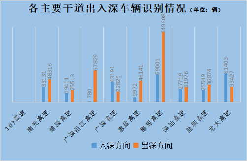 廣深高速新橋收費站,龍大高速羅田收費站,梅觀高速觀瀾路段、機荷高速清平至排榜立交、惠鹽高速荷坳路段,均出深方向車行緩慢。其中,出深車輛最多為梅觀高速,達到15萬輛。