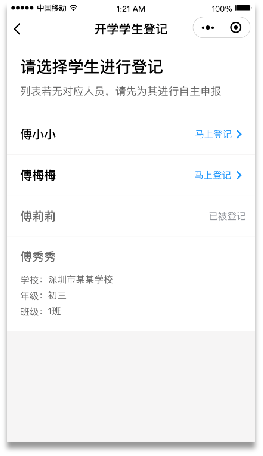 ①在首頁開學(xué)專區(qū),點擊“學(xué)生登記”進入申報人員列表,進行自主申報和實名認證,再進行開學(xué)登記。