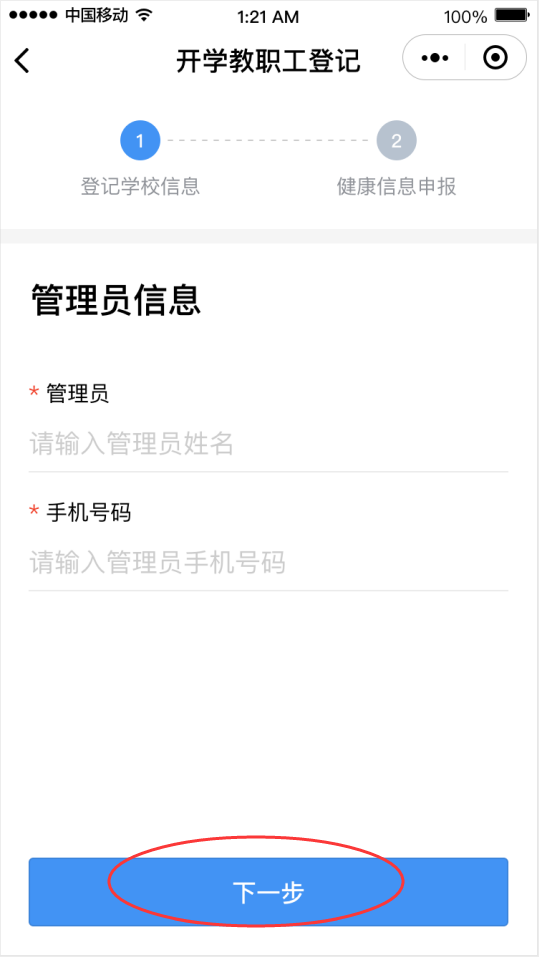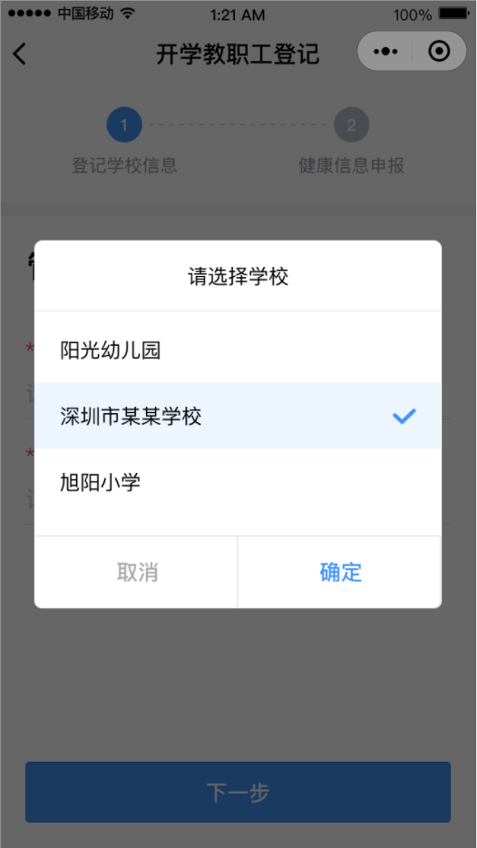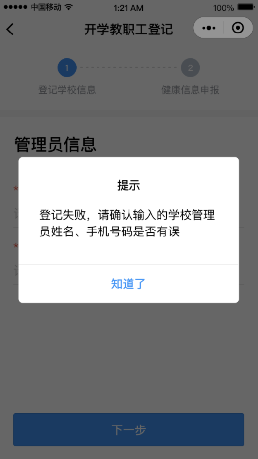 ②點擊“馬上登記”按鈕,填寫學(xué)校管理員姓名和手機號碼(學(xué)校管理員姓名和手機號碼請詢問學(xué)校獲得)后點擊“下一步”,然后選擇對應(yīng)的學(xué)校。