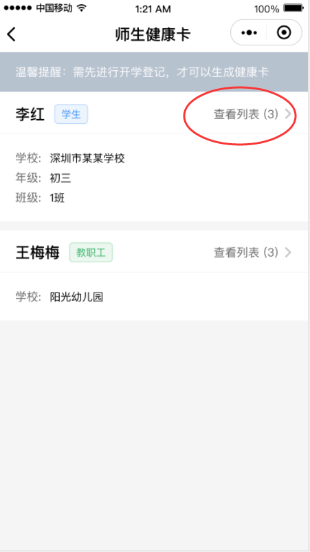 在開學(xué)專區(qū)點擊“師生健康卡信息”,然后點擊“查看列表”,可查看您的健康申報記錄,點擊“重新生成健康卡”進(jìn)行更新。