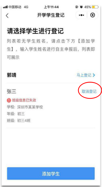 對于已完成開學(xué)登記的師生,如開學(xué)登記頁面顯示學(xué)校信息或班級信息已失效,或選錯登記人員時,請取消此條登記記錄,重新進(jìn)行開學(xué)登記。取消成功后,原申報的師生健康卡信息將會失效。以下操作步驟以學(xué)生登記為例,具體如下: