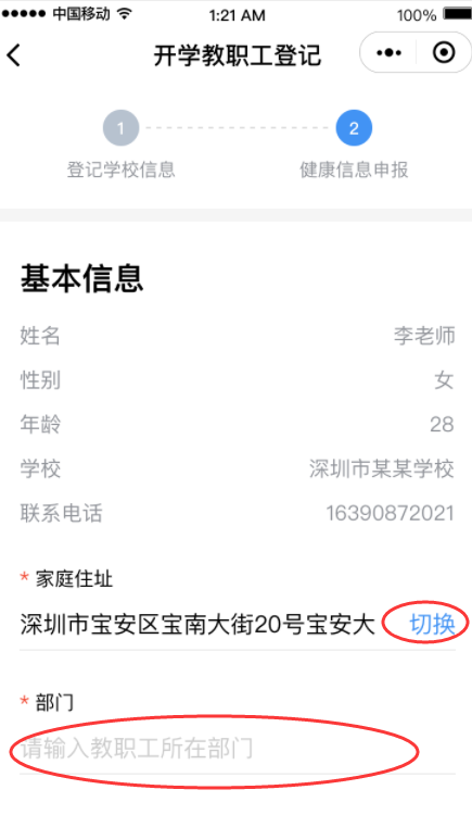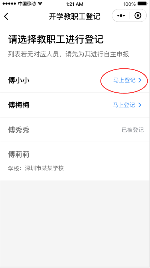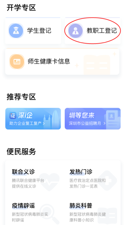 ①在首頁開學(xué)專區(qū),點擊“教職工登記”進(jìn)入申報人員列表,進(jìn)行自主申報和實名認(rèn)證。