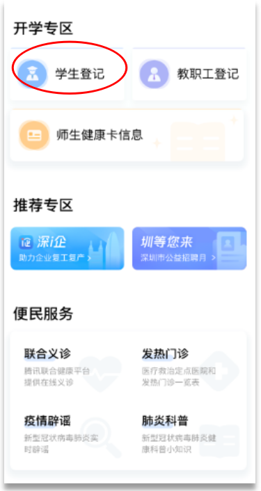 ①在首頁開學(xué)專區(qū),點擊“學(xué)生登記”進(jìn)入申報人員列表,進(jìn)行自主申報和實名認(rèn)證,再進(jìn)行開學(xué)登記。