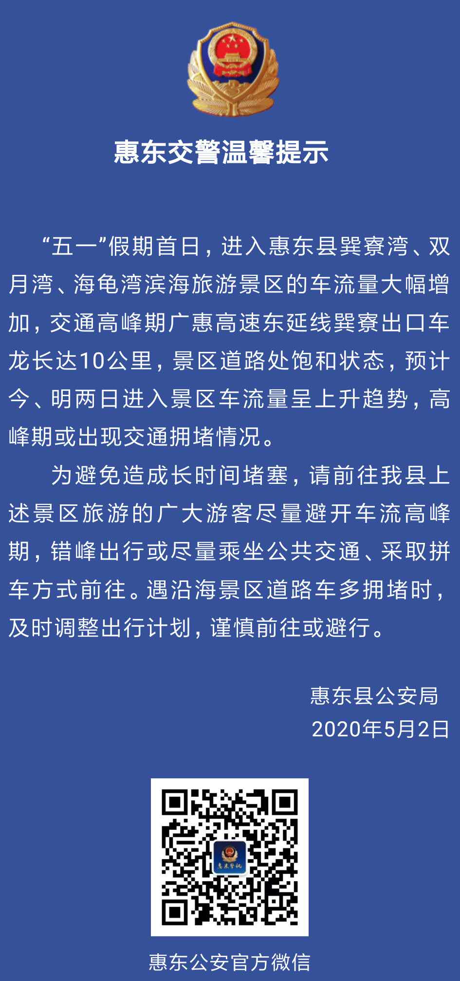 見圳客戶端·深圳新聞網(wǎng)2020年5月2日訊(深圳特區(qū)報記者 陳海峰 通訊員 羅漢波 文/圖)5月2日,惠州市公安局發(fā)布緊急提醒稱,“五一”假期首日,進(jìn)入廣東省惠州市惠東縣巽寮灣、雙月灣、海龜灣濱海旅游景區(qū)的車流量大幅增加,交通高峰期,廣惠高速東延線巽寮出口車龍長達(dá)10公里,景區(qū)道路處飽和狀態(tài)。