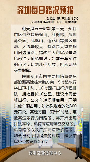 由于市民出行意愿較強烈,預計明日市內熱門商圈、景區(qū)、公園的車流量壓力仍較大,大鵬、鹽田等濱海景區(qū)車流量將會持續(xù)增加。