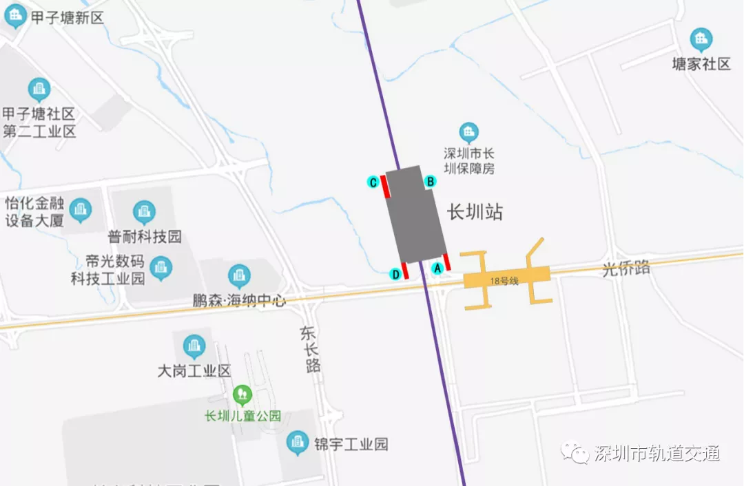 其中,A、B出入口位于光明大道東側(cè),C、D出入口位于光明大道西側(cè)。A出入口與龍光玖龍臺(tái)項(xiàng)目連通,C、D出入口與特區(qū)建發(fā)樂府廣場項(xiàng)目連通。
