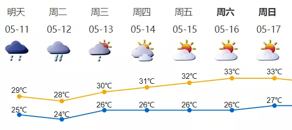 5月11日陰天,氣溫25-29℃,有陣雨或雷陣雨,伴有短時陣風(fēng)7級左右。12日有雷陣雨,局部大雨,局部有短時強降雨;13日陣雨轉(zhuǎn)多云;14-17日多云到晴天,天氣再趨悶熱。