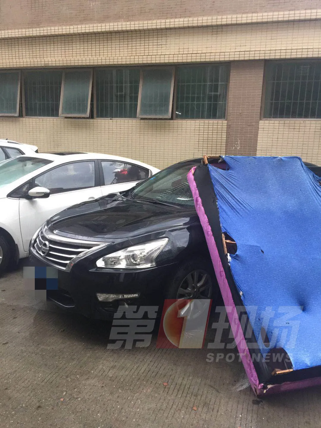 其中,龍華民治春華四季園42棟高層的儲水箱,砸到了樓下藍色轎車,造成車輛發(fā)動機蓋一處凹陷,多處刮痕。