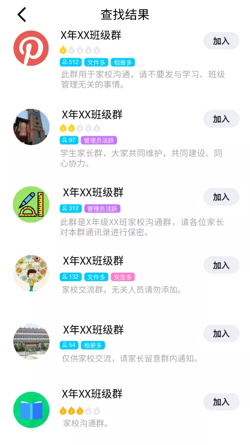 在QQ內(nèi)搜索“班級(jí)群”、“年級(jí)群”等關(guān)鍵字,即可檢索出大量的班級(jí)群聊。
