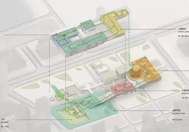 產業(yè)生態(tài)雨林的三個層級都可經由一個城市公園的多層級通道系統(tǒng)抵達,仿佛曲折蜿蜒的河水流過緩坡。