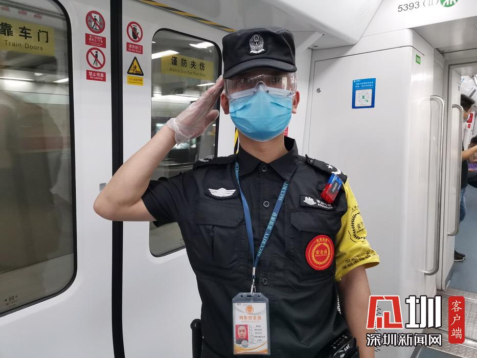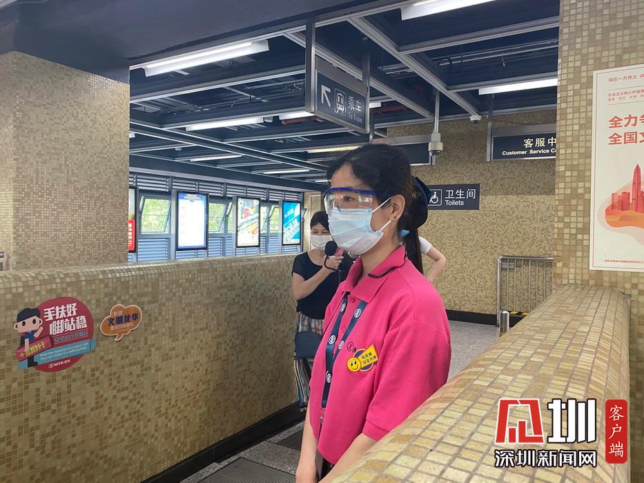 地鐵站內(nèi),一位工作人員整齊佩戴口罩與護目鏡,引導市民有序搭乘地鐵。