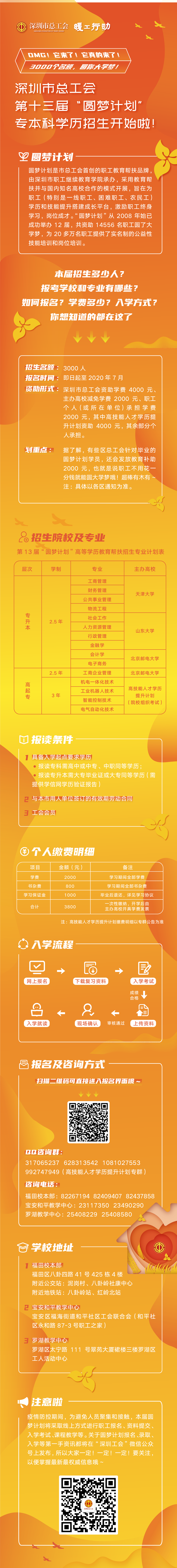 在疫情防控、復(fù)工復(fù)產(chǎn)的特殊形勢(shì)下,結(jié)合市總工會(huì)“暖工行動(dòng)”相關(guān)要求,本屆“圓夢(mèng)計(jì)劃”進(jìn)一步提高幫扶精準(zhǔn)性,向受疫情影響嚴(yán)重的企業(yè)和職工傾斜,推動(dòng)企業(yè)和職工共擔(dān)責(zé)任、共克時(shí)艱,穩(wěn)定職工隊(duì)伍和就業(yè),努力做到職工多轉(zhuǎn)崗、少下崗、多就業(yè)、少失業(yè)。符合報(bào)名條件的職工可在“深圳工會(huì)”微信公眾號(hào)上進(jìn)行報(bào)名,報(bào)名截止日期為7月30日,主辦方將根據(jù)報(bào)名人數(shù)分期分批組織入學(xué)考試。入學(xué)考試采用“文化素養(yǎng)+職業(yè)技能+工作實(shí)績(jī)”的多元評(píng)價(jià)方式,在“文化素養(yǎng)”為主體考試中增加工會(huì)基本知識(shí),提高職工工會(huì)意識(shí)。所有錄取學(xué)員將于今年9月入學(xué)就讀,進(jìn)行線上線下相結(jié)合的學(xué)習(xí),在規(guī)定學(xué)制內(nèi)修滿學(xué)分將獲得各高校頒發(fā)、國(guó)家承認(rèn)的畢業(yè)證書(shū)。