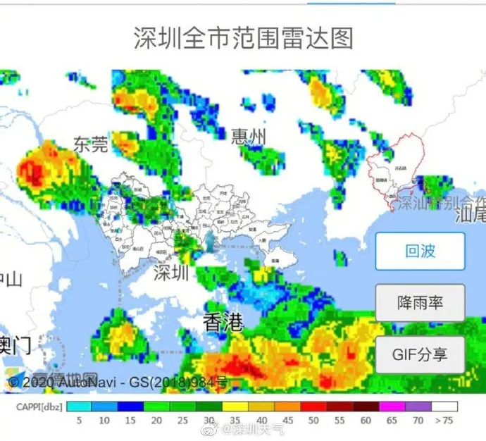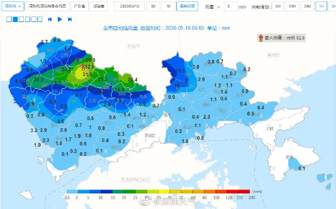 【深圳市分區(qū)暴雨黃色預警】預計福田區(qū),羅湖區(qū),南山區(qū),鹽田區(qū),大鵬新區(qū),西部海區(qū),東部海區(qū),寶安區(qū)(新安、西鄉(xiāng)、航城街道),龍崗區(qū)(南灣、坂田、園山、橫崗、布吉、吉華街道),龍華區(qū)(民治街道)和坪山區(qū)(馬巒、碧嶺街道)1-2小時內將出現(xiàn)20-40毫米降水,深圳市氣象臺于2020年05月18日15時50分在上述地區(qū)發(fā)布暴雨黃色分區(qū)預警,全市進入暴雨戒備狀態(tài),請注意防范。