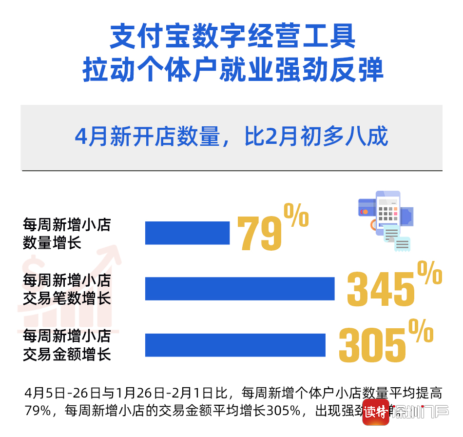 北京大學數字金融研究中心通過分析支付寶最新數據發(fā)現,與疫情中最低點相比,全國個體戶就業(yè)形勢已出現強勁反彈:隨著復工復產的全面推進和消費券的發(fā)放,4月以來與疫情最低點2月1日當周相比,每周新增個體戶小店數量平均提高79%,每周新增小店的交易金額平均增長305%。