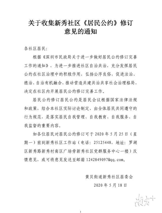 據(jù)了解,本次意見(jiàn)征集截至5月25日(星期一),對(duì)居民公約有建議的居民可于該日前到社區(qū)工作站反饋意見(jiàn),或可將意見(jiàn)發(fā)送至郵箱1242849097@qq.com。公約經(jīng)社區(qū)居民代表大會(huì)會(huì)議表決通過(guò)后實(shí)施。