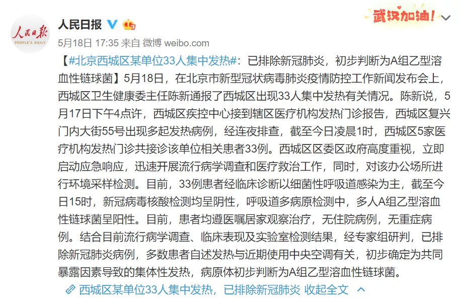 目前,33例患者經(jīng)臨床診斷以細(xì)菌性呼吸道感染為主,截至5月18日15時(shí),新冠病毒核酸檢測(cè)均呈陰性,呼吸道多病原檢測(cè)中,多人A組乙型溶血性鏈球菌呈陽性。