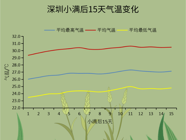 小滿后15天,深圳的平均氣溫為26.8℃,平均最高氣溫為30.2℃,出現(xiàn)33.0℃及以上的炎熱天氣平均有1.5天。盡管小滿時節(jié)的深圳還處在初夏,但給人的感覺已經(jīng)是盛夏了。歷史上小滿后15天深圳共出現(xiàn)10天的高溫天氣(最高氣溫≥35℃),其中1963年和2000年曾連續(xù)出現(xiàn)2天的高溫天氣。