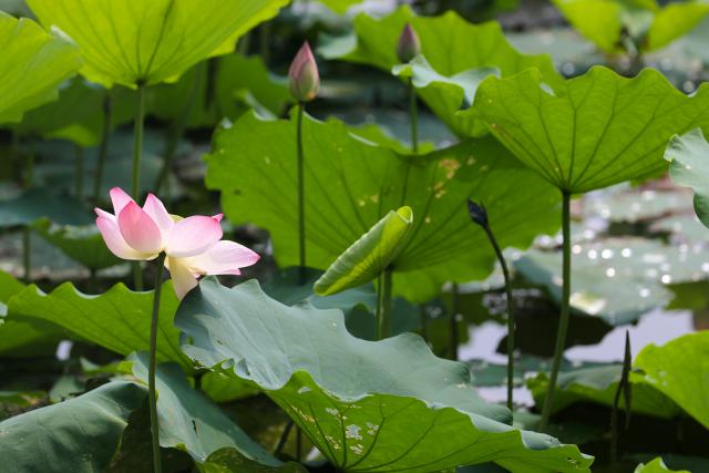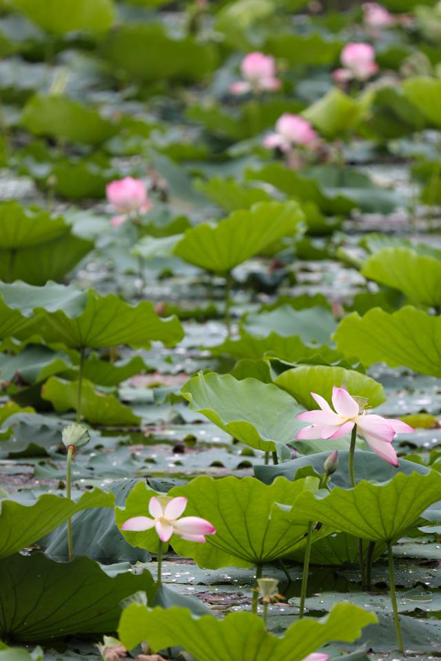 ▲公園內(nèi)主要荷花品種有粉色的"紅建蓮"和白色的"一丈青","紅建蓮"已大量盛開。