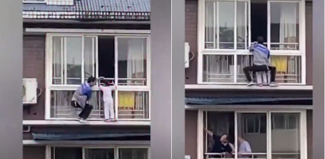 5月21日,四川富順縣一個5歲女童翻出6樓窗外,居民趕緊在樓下?lián)纹鸨蛔樱愤^的小伙胡云川則從5樓陽臺爬到6樓把孩子塞回屋內(nèi)。