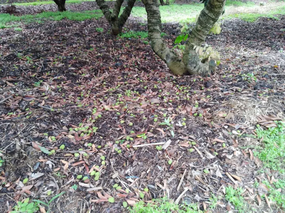 不遠(yuǎn)處的另一片果地里,是另一番景象。枝頭上,糯米糍、桂味一片青綠,爆裂的糯米糍散落一地。