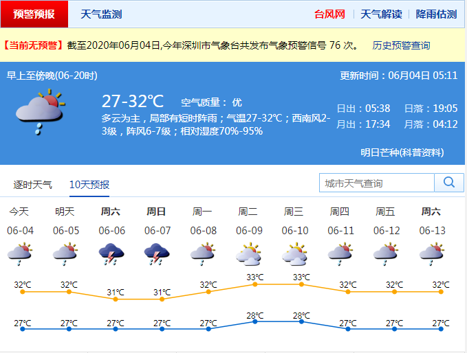 見圳客戶端·深圳新聞網(wǎng)2020年06月04日訊 深圳今日天氣多云為主,局部有短時(shí)陣雨;氣溫27-32℃;西南風(fēng)2-3級,陣風(fēng)6-7級;相對濕度70%-95%