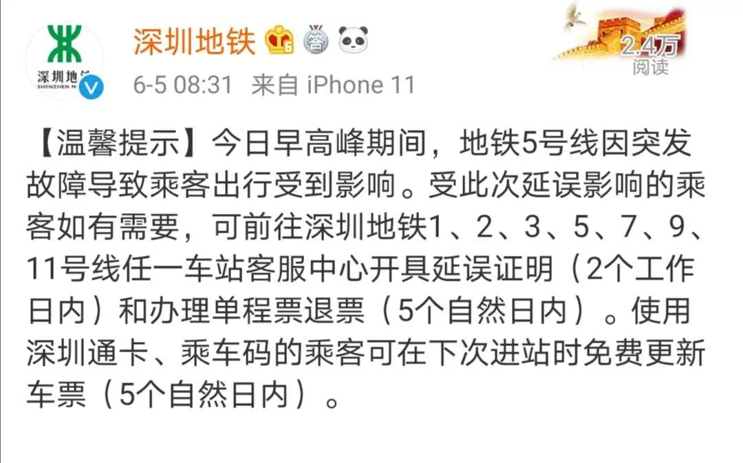 隨后,深圳地鐵官方微博發(fā)布溫馨提示,今日(6月5日)早高峰期間,地鐵5號線因突發(fā)故障導(dǎo)致乘客出行受到影響。受此次延誤影響的乘客如有需要,可前往深圳地鐵1、2、3、5、7、9、11號線任一車站客服中心開具延誤證明(2個工作日內(nèi))和辦理單程票退票(5個自然日內(nèi))。使用深圳通卡、乘車碼的乘客可在下次進(jìn)站時免費(fèi)更新車票(5個自然日內(nèi))。