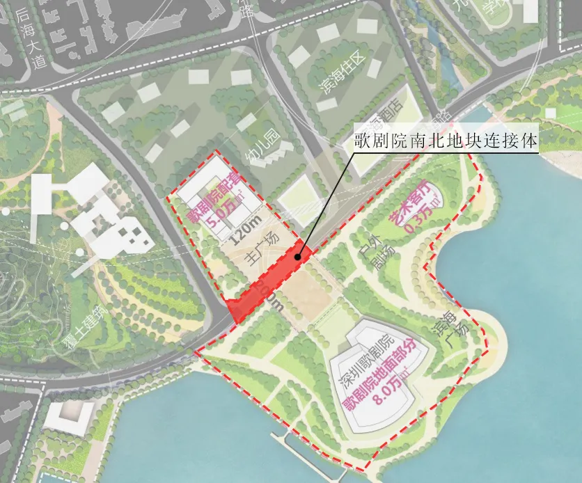 歌劇院分為南北區(qū)兩個(gè)地塊,南區(qū)為歌劇院主體功能地塊,北區(qū)為歌劇院配套功能地塊,南北區(qū)在地面被現(xiàn)狀望海路分割,在地下被擬建的望海路地下快速路分割,南北區(qū)被分割成獨(dú)立的兩個(gè)區(qū)域。