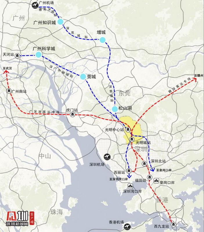 完善產(chǎn)學(xué)研結(jié)合的共享服務(wù)。光明科學(xué)城將建設(shè)產(chǎn)業(yè)服務(wù)中心和產(chǎn)業(yè)創(chuàng)新轉(zhuǎn)化服務(wù)平臺,鼓勵企業(yè)開放圍墻,增加沿街界面,鼓勵土地混合利用,提升產(chǎn)城融合水平,增加城市活力,促進產(chǎn)業(yè)創(chuàng)新。在交通網(wǎng)絡(luò)方面,光明科學(xué)城依托中深惠城際、深莞城際和城市軌道,加強與深圳寶安國際機場、廣州白云國際機場的快速聯(lián)系;依托廣深港客專、深莞城際、深廣中軸城際和城市軌道,加強與香港西九龍口岸、深圳灣口岸、皇崗口岸、福田口岸等的便捷聯(lián)系;加快深廣中軸城際、深莞城際軌道規(guī)劃建設(shè),推動深莞城際與深廣中軸城際、中深惠城際、中虎龍城際和莞惠城際的“互聯(lián)互通”。