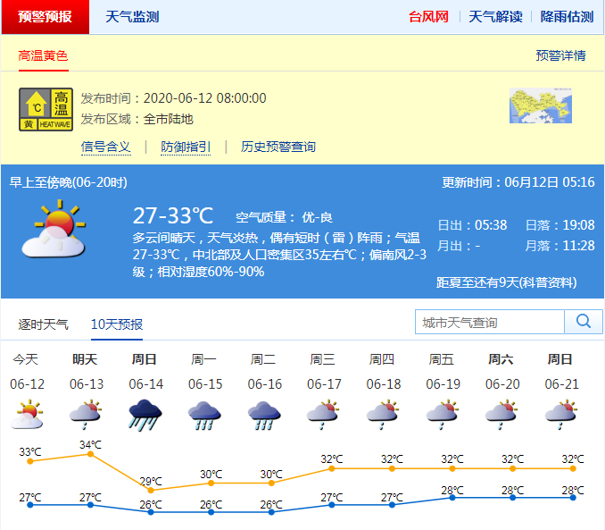 深圳市氣象臺于2020年06月12日08時00分在全市陸地發(fā)布高溫黃色預(yù)警。