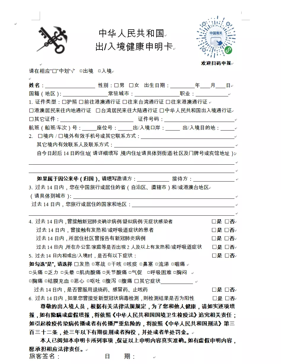 一、請?zhí)崆跋螺d打印《健康申明卡》(見附件1),或關(guān)注“海關(guān)旅客指尖服務(wù)小程序”(見附件2)。提前如實填寫紙質(zhì)或電子健康申報信息,通關(guān)時主動向海關(guān)申報。