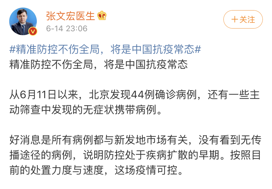 6月14日,張文宏醫(yī)生在微博上發(fā)布了名為《精準(zhǔn)防控不傷全局,將是中國抗疫常態(tài)》的文章,針對北京近日新發(fā)的新冠疫情,他是這么說的: