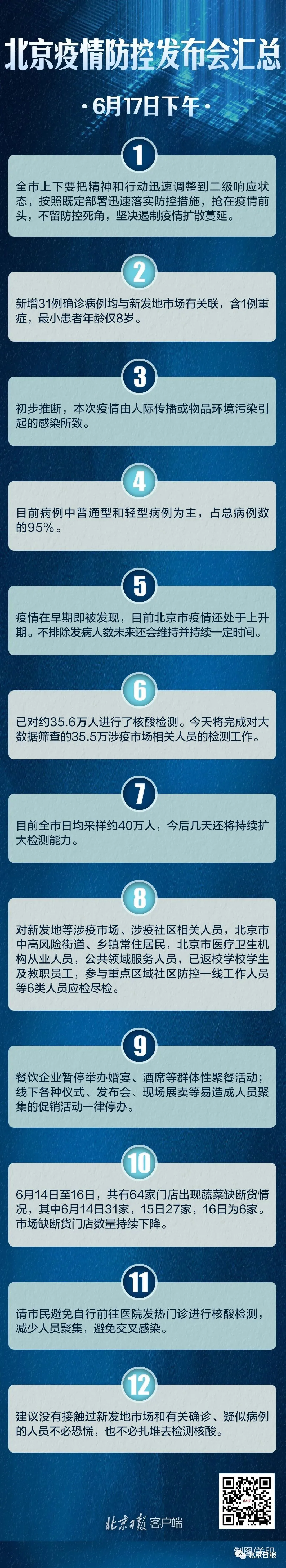 北京新冠肺炎疫情防控工作領(lǐng)導(dǎo)小組檢疫檢測(cè)工作組副組長、市委組織部副部長張強(qiáng)介紹,6月13日起,已迅速對(duì)新發(fā)地等出現(xiàn)疫情的市場(chǎng)人員、周邊小區(qū)居民、大數(shù)據(jù)排查涉疫市場(chǎng)人員,社區(qū)敲門行動(dòng)中主動(dòng)報(bào)告、有關(guān)接觸史的人員以及全市各農(nóng)貿(mào)市場(chǎng)工作人員約35.6萬人進(jìn)行了核酸檢測(cè)。6月17日將完成對(duì)大數(shù)據(jù)篩查的涉疫市場(chǎng)相關(guān)人員的檢測(cè)工作,對(duì)重點(diǎn)行業(yè)、重點(diǎn)領(lǐng)域、重點(diǎn)地區(qū)人員的核酸檢測(cè)工作也在同步進(jìn)行。