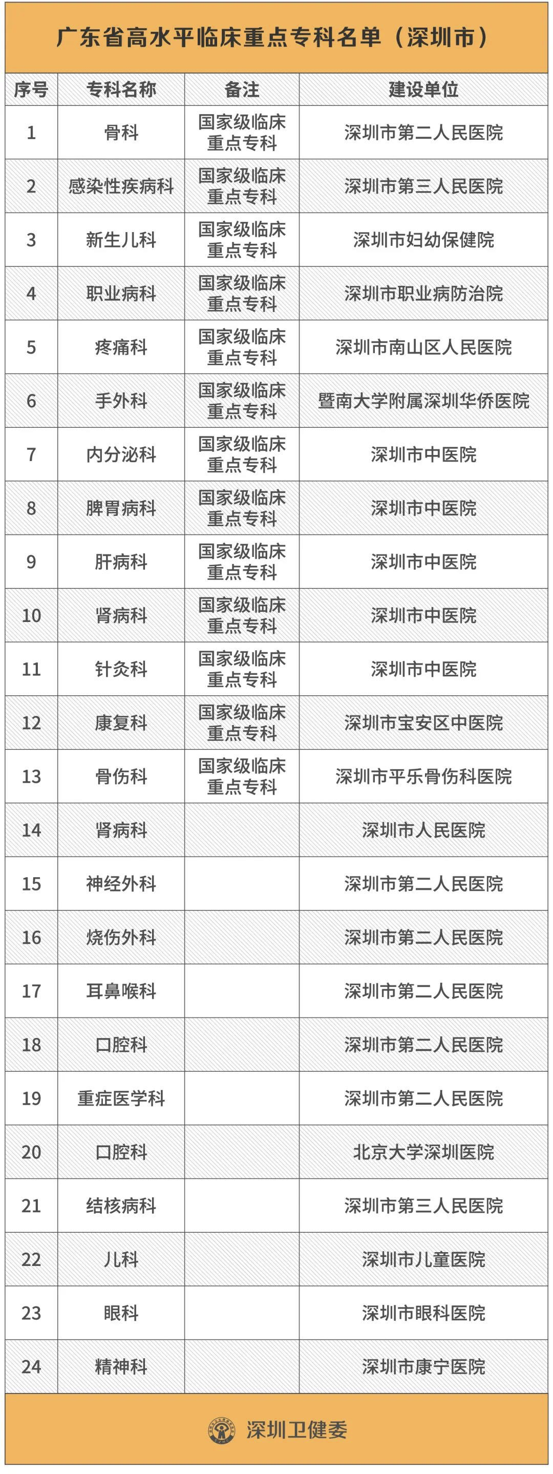6月19日,深圳市衛(wèi)健委公布了2020-2024年的深圳市醫(yī)學(xué)重點(diǎn)學(xué)科立項(xiàng)名單,包括80個(gè)重點(diǎn)學(xué)科、15個(gè)重點(diǎn)培育學(xué)科。此外,深圳還有24個(gè)??迫脒x“省重點(diǎn)”名單,其中13個(gè)是國家衛(wèi)健委或國家中醫(yī)藥管理局認(rèn)定的國家級(jí)臨床重點(diǎn)專科。這份名單是2019年由廣東省衛(wèi)健委公布的“廣東省高水平臨床重點(diǎn)??啤泵麊?。