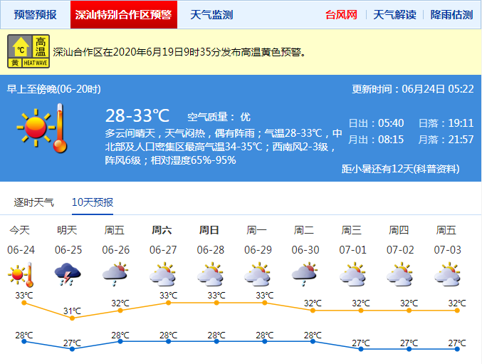 見圳客戶端?深圳新聞網(wǎng)2020年6月24日訊 據(jù)深圳市氣象局最新消息,深圳6月24日多云間晴天,天氣悶熱,偶有陣雨;氣溫28-33℃,中北部及人口密集區(qū)最高氣溫34-35℃;西南風(fēng)2-3級(jí),陣風(fēng)6級(jí);相對(duì)濕度65%-95%。
