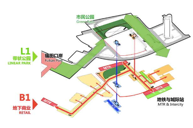 地下一層——軌道換乘:通過“城市通廊”實現(xiàn)周邊多條軌道站點的高效換乘,并實現(xiàn)新舊口岸、軌道交通及城市綠軸的高度復合。