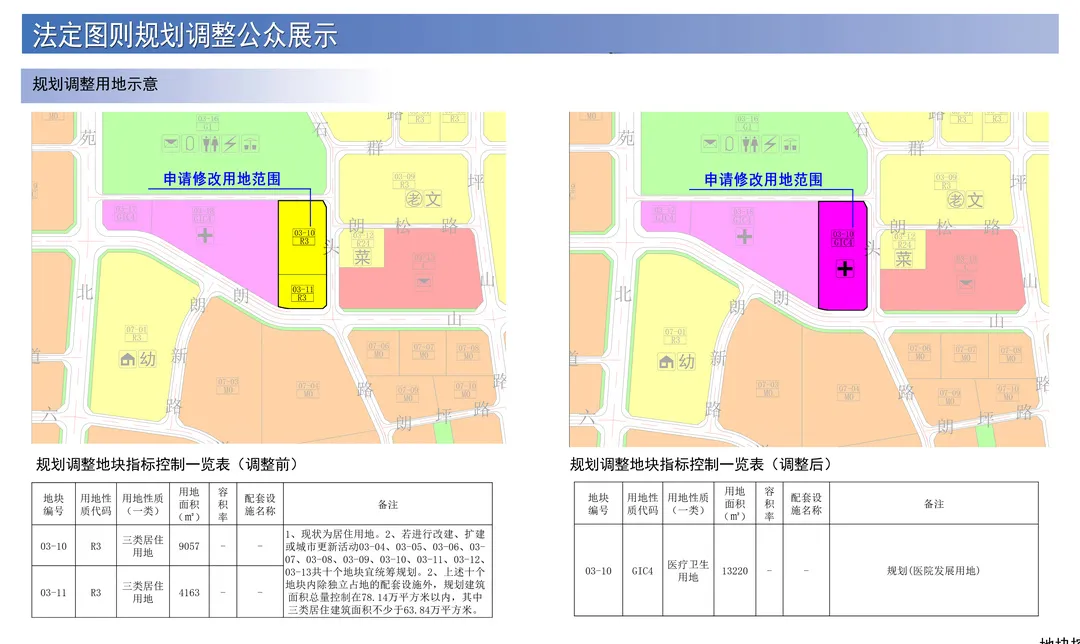 據(jù)悉,在擬調(diào)整前,03-10、03-11地塊規(guī)劃均為居住用地,用地面積分別為9057平方米、4163平方米。兩地塊與已建成的中國醫(yī)學(xué)科學(xué)院阜外深圳醫(yī)院南山院區(qū)僅一路之隔,位于其東側(cè),現(xiàn)狀為居住用地,建有6棟東西走向的住宅樓。