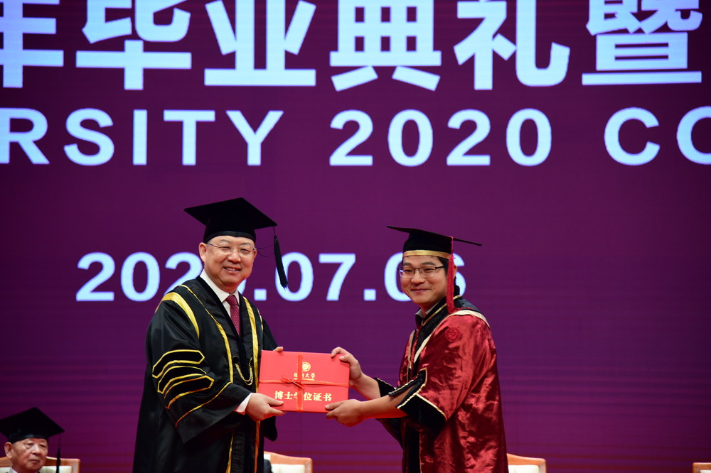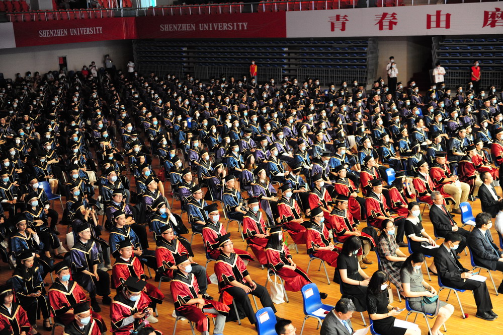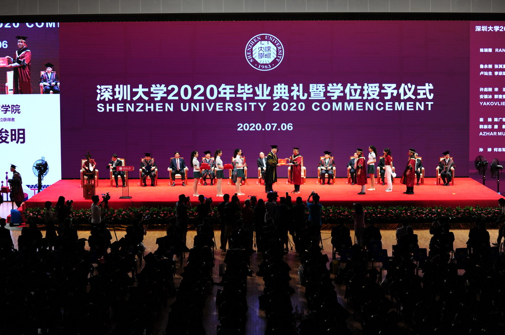 上午9時(shí),畢業(yè)典禮在莊嚴(yán)的國(guó)歌聲中拉開(kāi)了帷幕。據(jù)介紹,2020年深圳大學(xué)畢業(yè)研究生數(shù)量創(chuàng)歷史新高,達(dá)到2334名,包括44位博士學(xué)位獲得者,2290位碩士學(xué)位獲得者。其中,郭奎奎等20人獲得廣東省優(yōu)秀學(xué)生稱號(hào),李豪道等140人榮獲國(guó)家獎(jiǎng)學(xué)金,曾吉申等64人榮獲鵬城獎(jiǎng)學(xué)金、騰訊創(chuàng)新獎(jiǎng)學(xué)金。