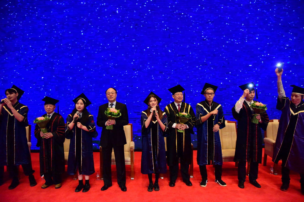 今天這場(chǎng)典禮和以往有些不同:許多朝夕相處的同學(xué)還沒(méi)來(lái)得及互道珍重,就已經(jīng)各奔前程。前些日子,我爬遍了深圳十大名山,本想以最fit的狀態(tài)為全體畢業(yè)生一一頒授學(xué)位,無(wú)奈事與愿違。作為校長(zhǎng),不能在重要時(shí)刻與大家逐一同框,讓我十分遺憾。即便如此,學(xué)校還是堅(jiān)持按往年的規(guī)格為畢業(yè)生代表舉行這場(chǎng)儀式,希望盡可能讓大家在特殊的年份感受母校給予的溫暖和信心。沒(méi)來(lái)現(xiàn)場(chǎng)的家長(zhǎng)、同學(xué)可以通過(guò)直播參與典禮。此刻,近萬(wàn)名畢業(yè)生,近萬(wàn)個(gè)家庭和全社會(huì)所有關(guān)心支持你們的人都在刷屏、點(diǎn)贊、發(fā)彈幕,我提議,讓我們用掌聲把共鳴打在公屏上!